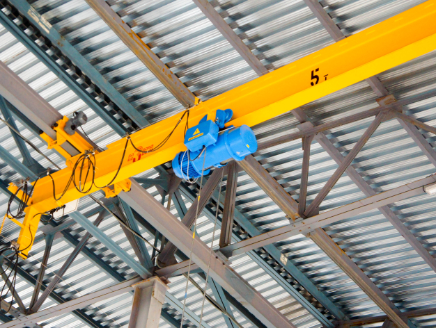 Кран-балка подвесная представляет собой сборную металлическую конструкцию. Основной несущий элемент у которой – это рама, изготовленная из специальной марки стали с повышенной ударной вязкостью. Рама прикреплена к приводным тележкам, которые перемещаются по направляющим путям – нижним полкам двутавров. Данный тип грузоподъемного оборудования размещается в закрытых помещениях или на площадках под навесами, что позволяет обслуживать всю рабочую площадь.